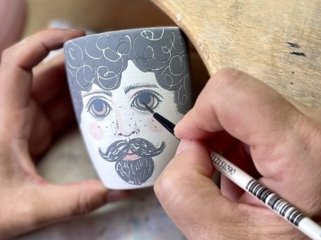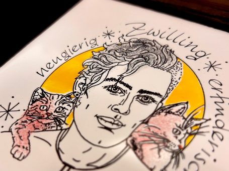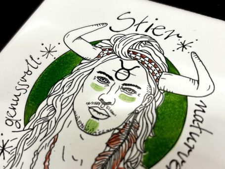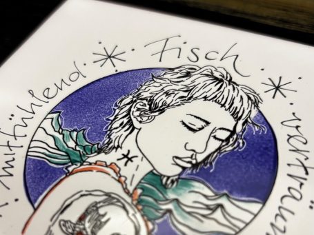 Die besonderen Handzeichnungen meiner Schwester, Grafikdesignerin Andrea Bell, übertrage ich per Schiebebild auf die Keramik. Danach schreibe ich mit feiner Feder den Text und dekoriere farblich. Unsere Sternzeichen haben wir in weiblicher und männlicher Form gestaltet.